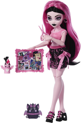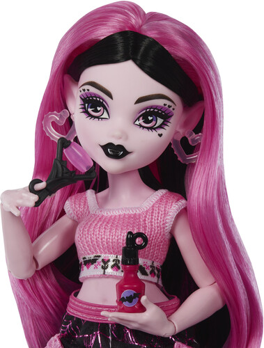 - Draculaura doll is ready for some self-scare time in her comfy knit top and skirt! Open mystery bags packed with fangtastic surprises to discover how this vampire likes to unwind.