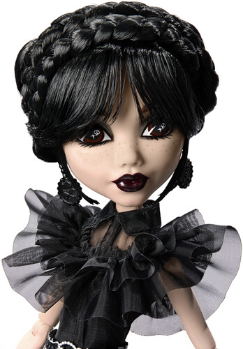 - Woe what a night! Inspired by her character’s vintage gown in the show’s school dance scene, this Rave’N Wednesday doll makes goth glam in a midnight black dress.