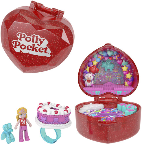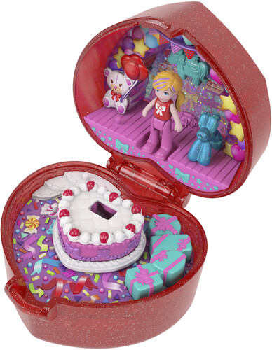 Celebrate with Polly in a heart-shaped Ring Box Compact featuring a transparent glitter finish. Inside, Polly doll enjoys a festive party scene complete with a balloon animal pet and a removable, adjustable cake-themed ring.