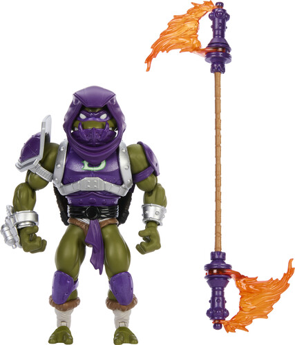 Includes 1 Turtles of Grayskull Donatello figure, 1 removable hood & face guard, 2 removable shoulder armor pieces, 1 removable waist sash, 1 staff with 2 removable mace cap ends and 2 removable flame effects, 1 removable turtle shell/shield and 1 mini-comic.
