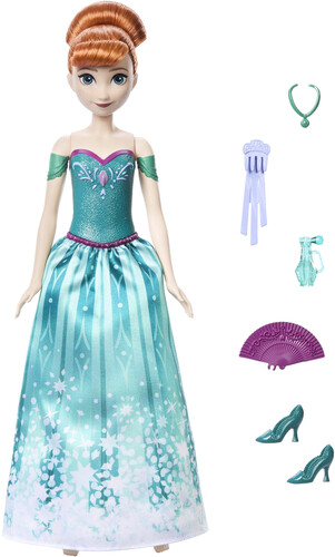 - The final reveal is a beautiful Anna fashion doll with soft hair in a fun updo, a removable skirt and fashion accessories like shoes and a fan for creating regal looks.