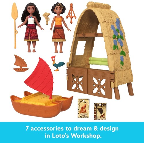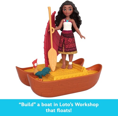 Includes Workshop playset, Moana small doll, Loto small doll, Heihei animal friend, floating canoe and 5 accessories.