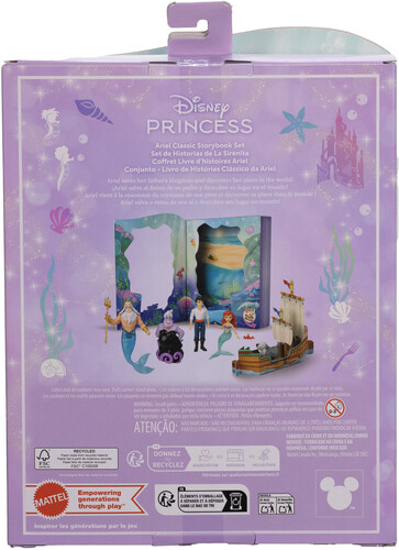 Ariel Classic Storybook Set includes an Ariel doll in her signature mermaid look, Prince Eric, King Triton, Ursula, and Max and Sebastian animal figures. The set comes in a storybook-style package with perforated play pieces that kids can pop out to expand the storytelling fun.