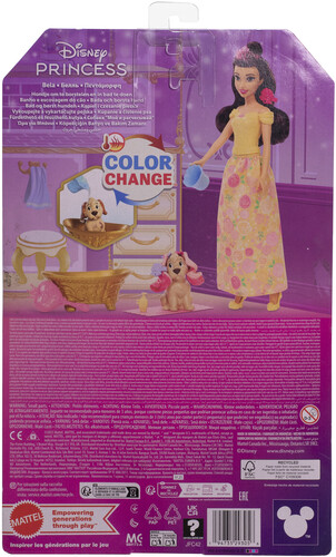 Inspired by the animated characters in Disney's Beauty & the Beast movie, this set includes a Belle fashion doll in her signature color and a sweet dog figure in need of a bath! With a bathtub, towel and warm water, kids can 'clean' the dog through color-change magic then style the pretty pup with the included brush, hair extensions and barrettes. Now Belle and her dog are ready for the day's adventures!