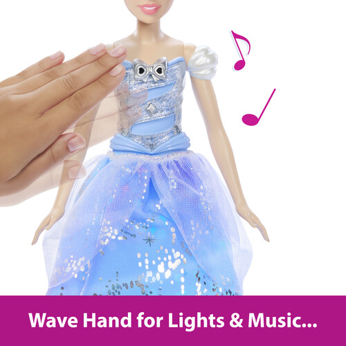 - With the wave of the wand (or a hand), Cinderella doll's dress lights up while magical sounds play four different light and sound patterns in all!