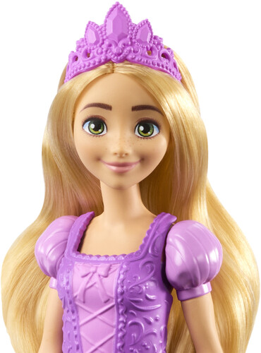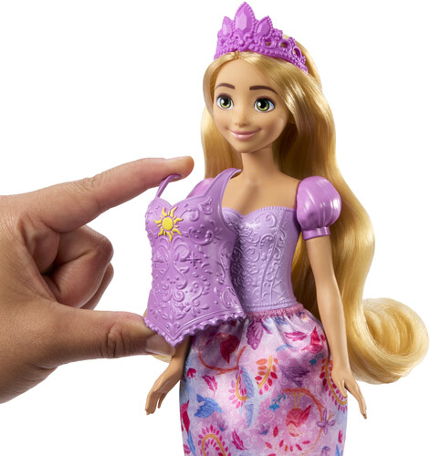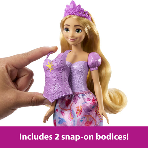- This easy-to-dress Rapunzel doll comes with two bodices that snap on and off and two skirts printed with icons from her stories.