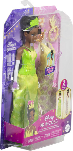- This easy-to-dress Tiana doll comes with two bodices that snap on and off and two skirts printed with icons from her stories.