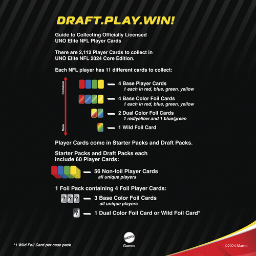 - Search for rare WILD Foil Cards in the foil packs found in 2024 Core Edition Starter Packs. On average, there is a 1 in 4 chance you’ll find one in any UNO Elite NFL Starter Pack. Which one will you get?