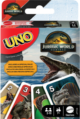 - The UNO game players love features graphics inspired by characters from Jurassic World Rebirth.