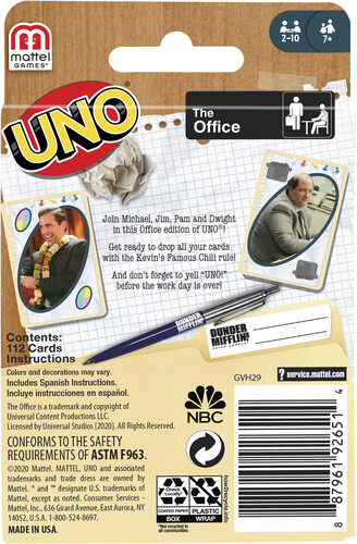 Gameplay is the same as classic UNO with players matching colors and numbers as well as throwing down wild cards and penalty cards to trip up their opponents. When they're down to one card, they have to shout like they just got a bonus, "UNO!" Makes a great gift for The Officefans, ages 7 years and older.