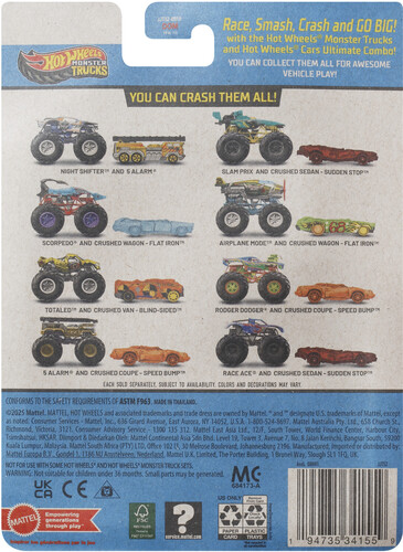 Each set includes two metal vehicles with matching designs, perfect for thrilling collisions and races. With huge wheels and stunning details, kids will want to collect all vehicles and create epic Monster Truck battles. The back of each package provides information on vehicle name, type, crash dynamics, and horsepower.
