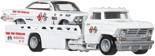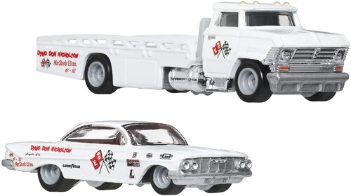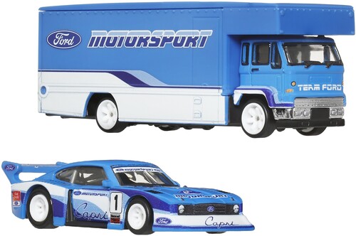 - Each set includes a 1:64 scale race car and its corresponding transport vehicle.