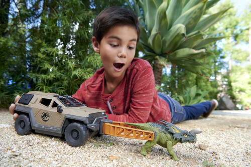 - Flippin' fun! This Jurassic World truck is ready for a mission of mayhem, with a feature that takes destruction play to new levels. If the dinosaur rams the side door, it flips over and the cab detaches!