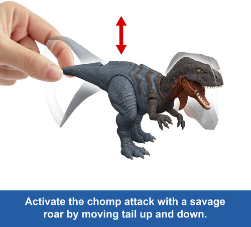 It's a Total Attack kids can easily move the tail up and down on this dinosaur toy to activate a vicious chomp action, accompanied by a savage roar, then twist the tail to change the direction of the chomp! This 12-inch long movie-inspired figure has posable joints, ready for exciting battle play or dramatic display.