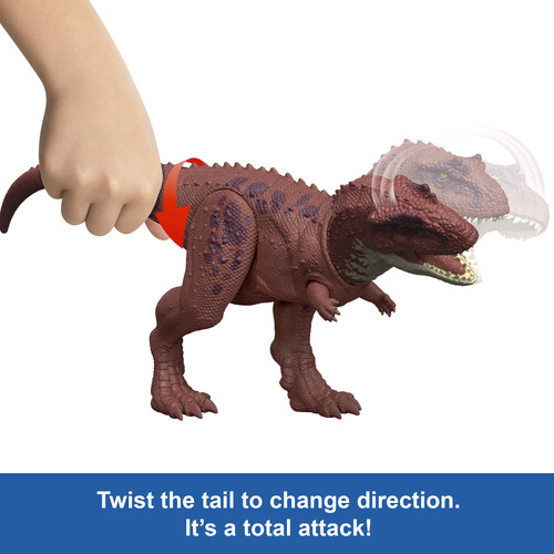 It's a Total Attack kids can easily move the tail up and down on this dinosaur toy to activate a vicious chomp action, accompanied by a savage roar, then twist the tail to change the direction of the attack! This 12.8-inch long movie-inspired figure has movable joints, ready for exciting battle play or dramatic display.