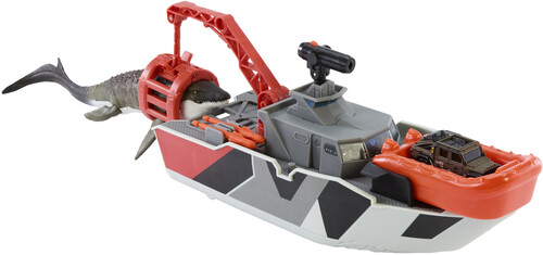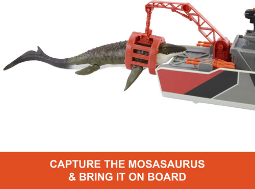 - The 12.5” boat features realistic details like a working winch that can clip onto the included 13” Mosasaurus. Watch out for its moving jaw and fins as it’s reeled onboard!