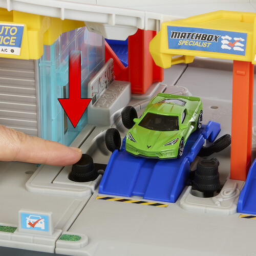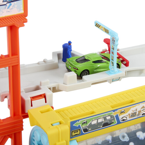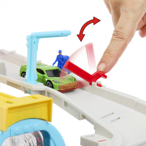 Get race-ready in the pretend tune-up station where there's a working vehicle lift and tire-change station make sure the wheels are aligned! On the top level, a moveable attendant supervises the traffic flow, then directs cars to the cyclone tunnel for a wash. Kids pull a lever to make the tunnel spin, and it will randomly stop on one of three different settings: dirty, soapy and clean. When it lands on the clean icon, the car races down to ground floor.