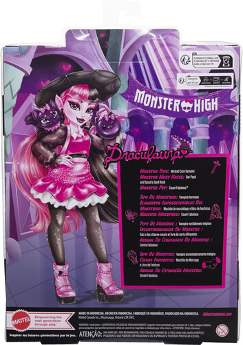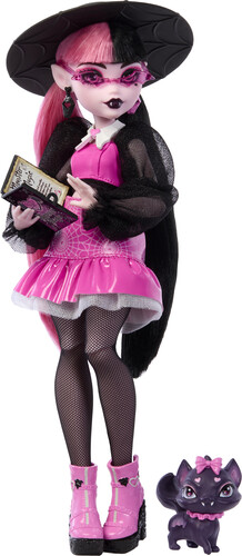 Includes 1 Draculaura doll, 1 pet figure, and accessories. Doll stand not included. Doll cannot stand alone. Colors and decorations may vary.