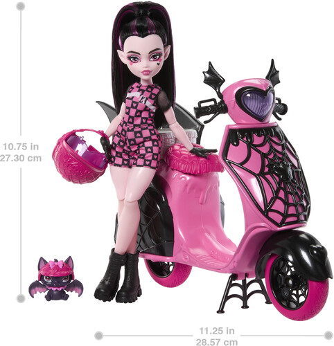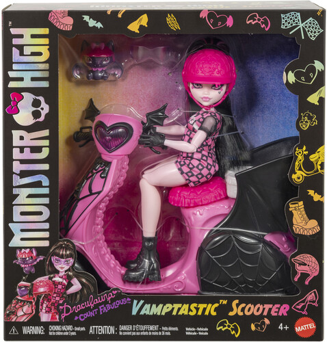 Includes: Draculaura figure, Count Fabulous Figure, 2 helmets, Scooter Vehicle