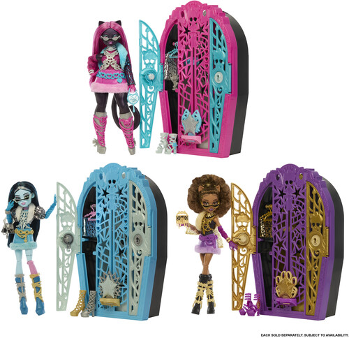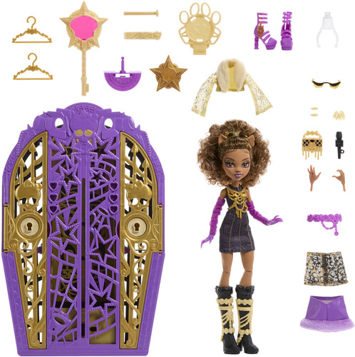 Includes 1 Clawdeen Wolf doll, 1 closet with two doors, 1 key, 2 maps, 3 charms, 2 hangers, and assorted clothing and accessories.