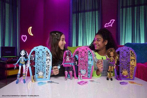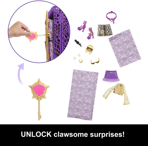 - Insert the talisman at the base of the closet, then glide it up like a zipper to unveil Clawdeen Wolf doll in all her iclawnic glory! Repeat the reveal again and again for nonstop fun.