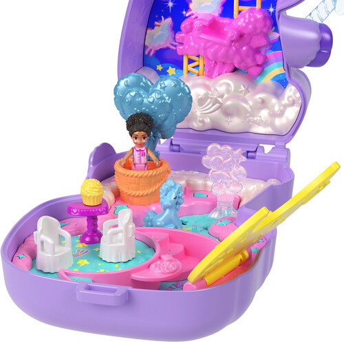 - Dream big! This Polly Pocket Cozy Dreamland Compact features one micro doll and nine accessories, including one pet unicorn.