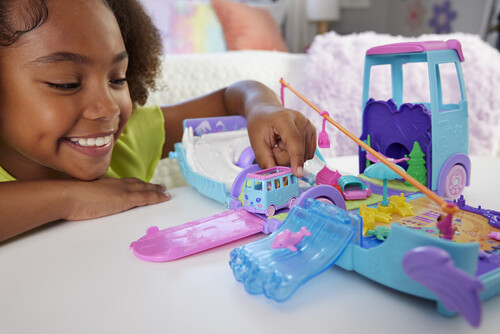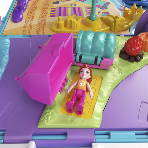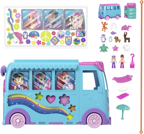 Join Polly Pocket and friends for a road trip in the transforming Pet Mobile Adventure Playset!