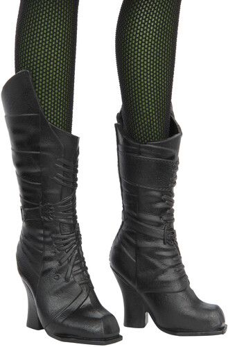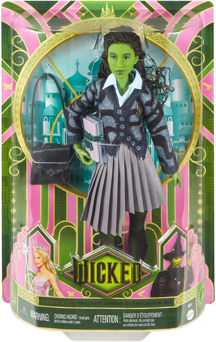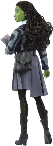 - Inspired by Universal Pictures' Wicked, Elphaba doll wears her removable school uniform, like her button up cardigan, asymmetrical skirt, leggings, and boots.