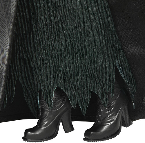 Just like in the film, Elphaba stuns in her true-to-movie gown with textured, sparkly details and cape with frayed edges. Her broom, hat, Grimmerie and boots pair beautifully with the removable outfit. Her long, flowing braided hair completes the legendary look.