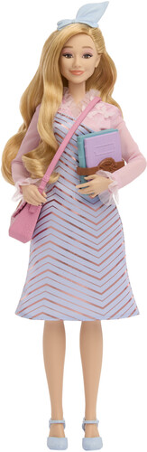 The fashion doll is dressed in her removable Glinda-fied school uniform, including her blue, striped asymmetrical dress fashionably styled over her pink, blouse with butterfly accents! Glinda also features her iconic look with true-to-movie details, like her long, styled blonde hair and school accessories!