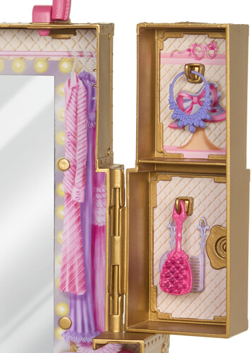 Just like in the film, this fold & go closet is made up of 3 connected trunks that open up & out to reveal 2 bewitching fashions & accessories for endless mixing & matching. With surprises like a mirror, doll stand and pop out clothes rack, kids can recreate moments from the magical movie.