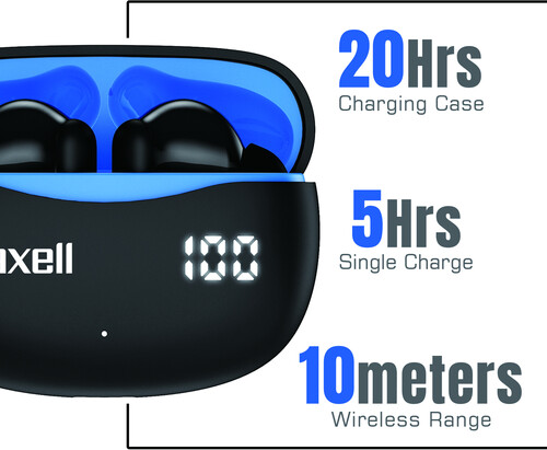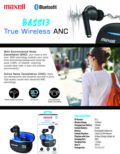 Maxell ANC-BLU Bass 13 Bluetooth Earbuds Active Noise Cancelling - True Wireless (Black)
