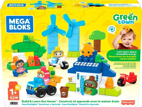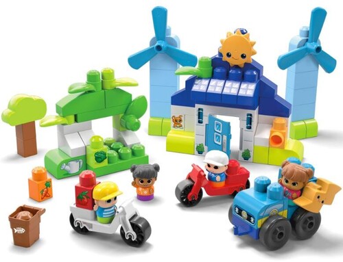 Little builders can learn about green behaviors like renewable energy, playing outdoors and energy consumption at the "Build & Learn Eco House" with 4 Block Buddies figures.