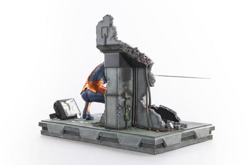 The statue is inspired by the intense boss battle where Cyborg Ninja and Solid Snake face off against Liquid Snake, who is piloting the Metal Gear REX. It depicts Cyborg Ninja in a dynamic, ninja-like pose, wielding his high-frequency blade in his right hand. The statue faithfully captures his appearance, showcasing the blue, brown, and white Cyborg Ninja Exoskeleton, with the distinctive red lamp in the center of his face mask flanked by eyeholes on both sides. The base design meticulously recreates the scene of the boss battle set in the underground base of Shadow Moses.