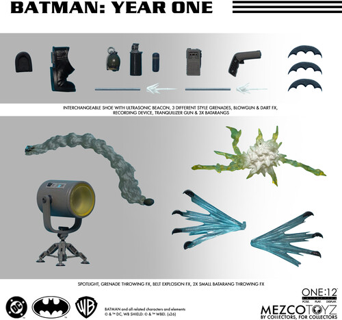 Equipped with an experimental arsenal, Batman comes prepared with batarangs, explosives, a blowgun with dart effect, a recording device, a floodlight, and additional accessories recreating key moments from Year One.