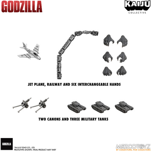 The beastly behemoth comes with interchangeable hands that allow him to hold his included accessories like a jet plane and railway. The included dilapidated building replicas, military tanks, canons, and heat ray FX assist in recreating a multitude of unique display options.