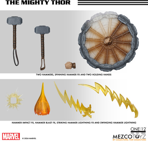 - Seven (7) interchangeable hands: One (1) pair of fists (L&R), One (1) pair of posing hands (L&R), One (1) pair of flying hands (L&R), One (1) hammer holding hand R)