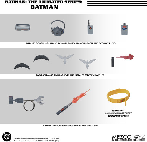 When the night demands more than just skill and strength, Batman comes equipped with infrared goggles for enhanced vision, a re-breather mask for underwater pursuits, a remote to summon the Batmobile, and many more crime-fighting tools.