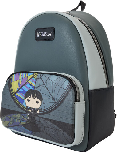 Stroll the halls of Nevermore Academy in style with the Wednesday Funko Mini Backpack! The front pocket of this black and grey mini backpack features POP! Wednesday Addams performing a cello solo, illuminated by her dormitory window. This eerie accessory has plenty of room for holding all of your belongings whether you are on your way to class or picking up a new extracurricular! Backpack is made of vegan leather (polyurethane) and has adjustable shoulder straps. Additional features include sturdy metal hardware and printed details. This backpack is an officially licensed Wednesday product. Approximate dimensions: 8.25” W x 10.75” H x 4” D. (Please note: width is measured across the bottom of the bag.)
