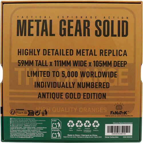 Synonymous with the Metal Gear Solid series of games, the humble cardboard box was used extensively as cover to sneak around by Raiden in Metal Gear Solid 2, and that version is replicated here in metal form with an antique gold finish. Each officially licensed box is heavily embossed and limited to 5,000 worldwide.