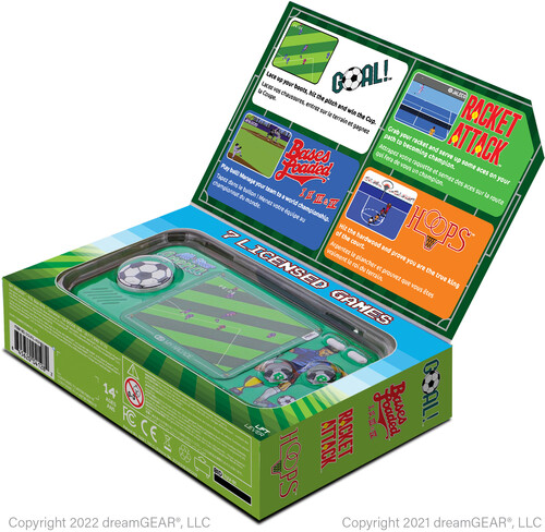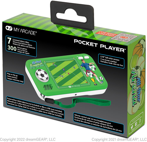 Includes fully playable versions of GOAL!™, BASES LOADED™ 1,2,3 & 4, RACKET ATTACK™ and HOOPS™. The All-Star Arena Pocket Player features a full color 2.75" screen to brightly display all 7 titles and is fine-tuned for hours of play through its emphasis on ergonomics and compact design.