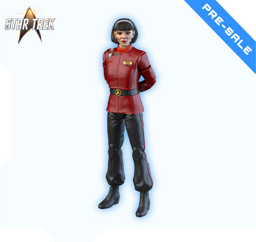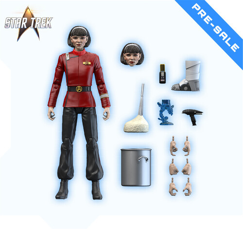 Captain Spock’s young Vulcan protégé arrives as an articulated 1/10-scale action figure, complete with several artifacts from her mission on the U.S.S. Enterprise-A: a Starfleet phaser and communicator, the ornate Vulcan goblet from Spock’s quarters, an incriminating gravity boot used in the assassination of Klingon Chancellor Gorkon… and of course, a pot of mashed potatoes for target practice.
