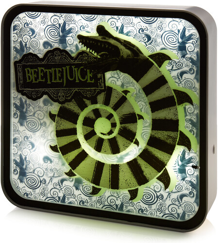 It’s showtime! Add a touch of the supernatural to your décor with this official Beetlejuice lamp. This acrylic lamp is made up of a front layer featuring the Beetlejuice logo and the iconic Sandworm, set against a patterned backdrop - switching on the lamp illuminates the background and reveals a soft, green glow around the Sandworm and logo, enhancing the 3D look whilst brightening up any dark room.