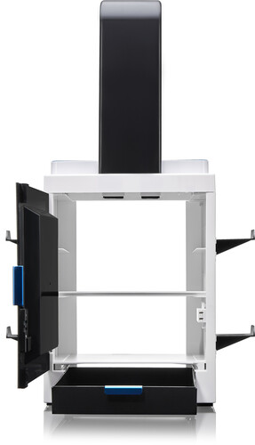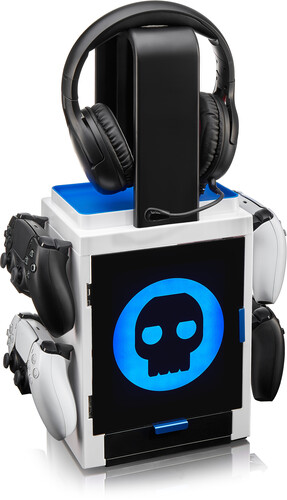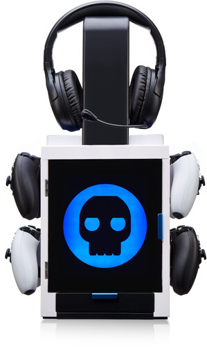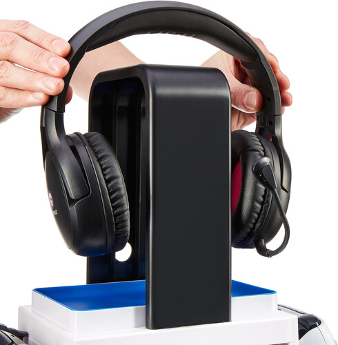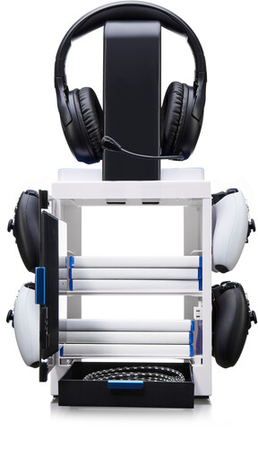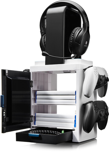 This smart, contemporary storage solution also features dedicated headphone and controller mounts, storage space located inside for up to 10 games, an integrated tray for your mobile devices and a draw for any cables and accessories.