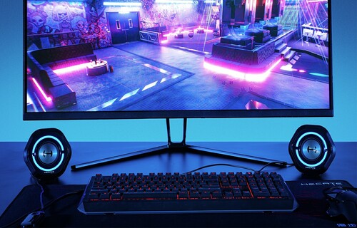 RGB Lighting: With the one-button switch of 12 patterns of RGB ambient lighting effects and the “oxeye” design, the speakers look futuristic and cool. The compact design will not overpower your gaming setup.