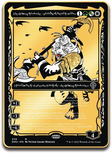 These Magic: The Gathering Phyrexian Dominaria United Pins feature epic designs in gold blackout and the Phyrexian language.