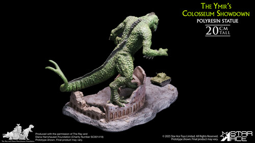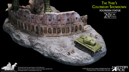Though the film was shot in black and white, this collectible bursts with vivid color inspired by the vintage movie poster, from the Ymir’s striking emerald-green hide to the earthy tones of the Colosseum.