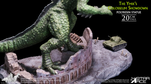 Step into the thrilling finale of 20 Million Miles to Earth (1957) with this intricately crafted polyresin diorama, recreating the Ymir’s legendary clash against military forces in the heart of Rome. Standing 20cm tall, the alien creature is in a dynamic pose, its textured scales and fierce expression meticulously sculpted to mirror Ray Harryhausen’s original stop-motion marvel. Below, tanks takes aim at the beast, framed by the iconic arches of the Colosseum – a haunting blend of ancient ruins and 1950s sci-fi spectacle.