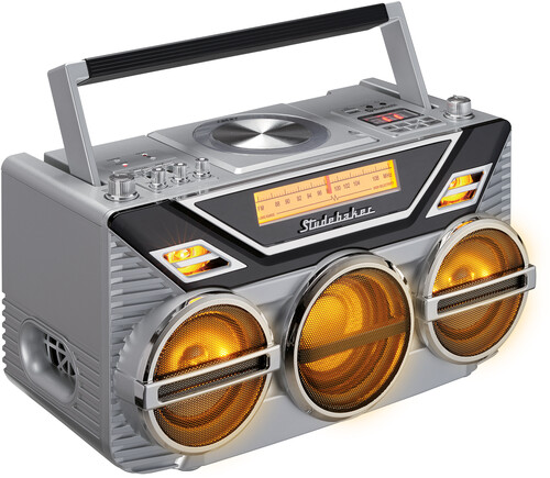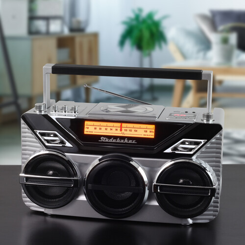 Pump up the bass with the Avanti Stereo Boombox from Studebaker. This boombox features a 15W Subwoofer for consistent high-power bass guaranteed to rattle your windows. Bluetooth Receive and Transmit functions allow you to stream music, podcasts, and other audio as well as use wireless headphones for private listening. Enjoy FM stereo analog radio with a back lit dial scale. This unit comes with a top loading CD Player that is CD/MP3 compatible with 20 programmable tracks for both the CD Player and USB playback (up to 32GB).