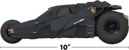 Measuring 10” long, 6.4” wide, and 3.5” tall, this Batmobile Tumbler is packed with hidden details. The fearsome exterior features rolling wheels and movie-accurate details like sculpted gas caps, spoiler, and finely crafted engine components—every inch of this Tumbler is designed to capture its unstoppable presence on the streets of Gotham.